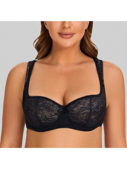 MELENECA Women's Balconette Bra With Padded Strap Half Cup Underwire Sexy Lace - 黑色 - 查看 1