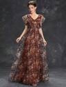 大码女式V领雪纺褶皱荷叶边袖长款伴娘晚礼服