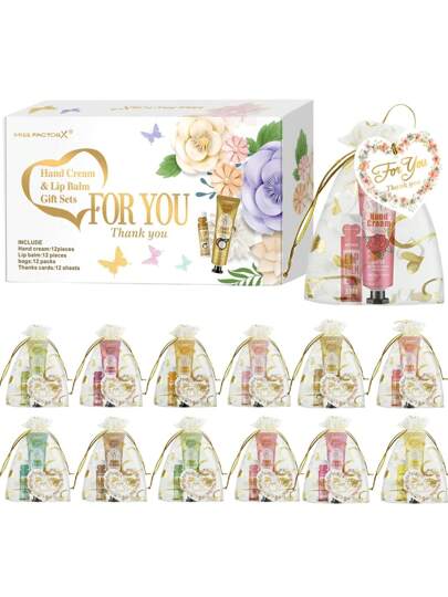 12盒/箱婚禮派對唇彩修護霜禮品盒,適用於新娘、女性、朋友,附送愛心袋及感謝卡,適用於公司員工禮品分發