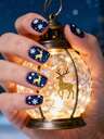 24片中号杏仁形美甲贴纸,简约红色法式亮面全覆盖假指甲,带有银色闪粉线条和白色星星装饰,适合女性和女孩 - 包含指甲锉和果冻胶美甲用品