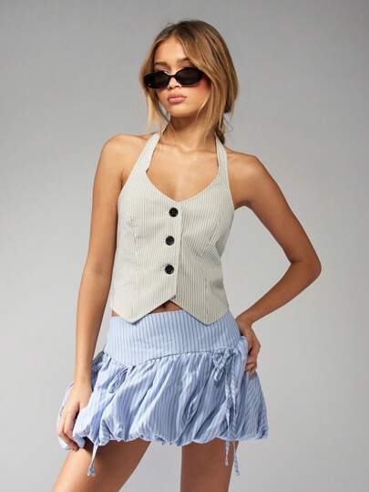 MISSGUIDED 泡泡迷你裙细条纹夏季时尚高腰聚拢气球短裤风格设计带侧袋休闲春季家居服 - 藍色 - 查看 3