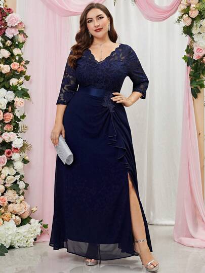MIUSOL 大碼荷葉邊高衩蕾絲正式洋裝 - 藏蓝色 - 查看 1