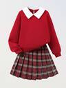 SHEIN 女童珍珠纽扣装饰长袖彼得潘领中长褶皱连衣裙,可爱甜美学院风,时尚百搭,秋冬款