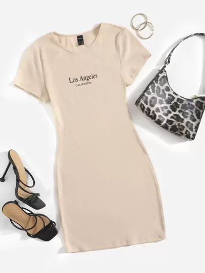 SHEIN EZwear 字母圖案羅紋針織洋裝 - 卡其色 - 查看 1