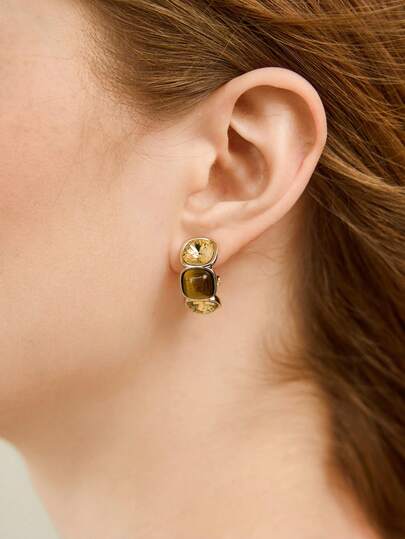 MOTF PREMIUM 轻奢时尚方形虎眼石拼接耳钉 女款,港式气质美拉德耳环 - 金色 - 查看 1