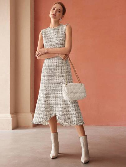 MOTF PREMIUM 粗花呢毛邊洋裝 - 黑與白 - 查看 5
