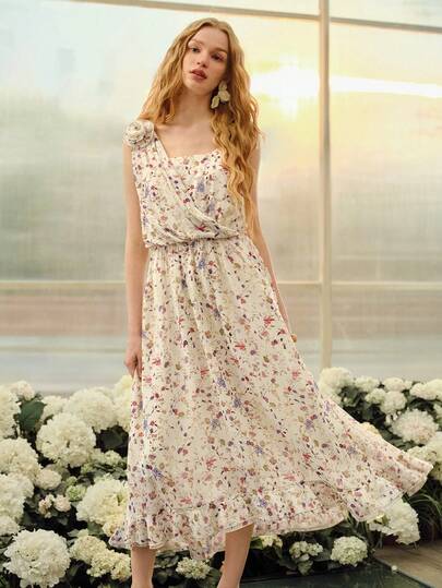 MOTF PREMIUM 女士浪漫印花不对称领连衣裙,春夏款 - 杏色 - 查看 5