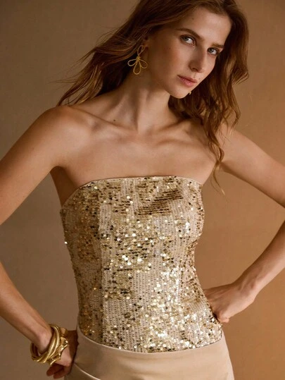 MOTF PREMIUM 女士亮片刺绣天鹅绒拼布解构迷你连衣裙 - 金色 - 查看 1