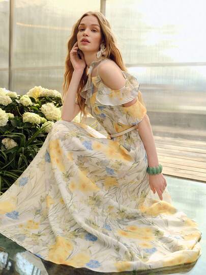 MOTF PREMIUM 女士束腰喇叭裙摆浪漫印花连衣裙,春夏款 - 黃色 - 查看 1