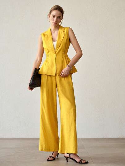 MOTF PREMIUM 女士黄色亚麻基本款优雅阔腿裤,适合通勤 - 黃色 - 查看 1