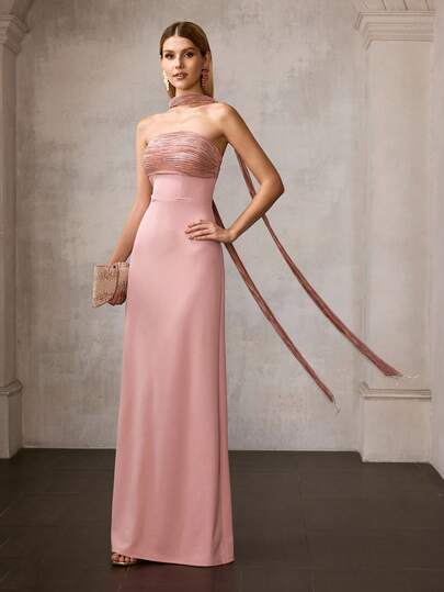 MOTF Soiréza 优雅修身无肩带长款派对礼服 – 可拆卸领子,胸前褶皱鸡尾酒裙 | 适合婚礼、晚宴和新年夜等场合,女士之选 - 粉色 - 查看 1