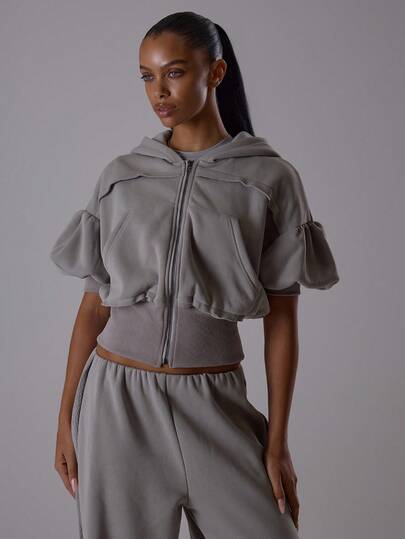 MUSERA 露脐收腰短款灯笼袖露缝细节连帽卫衣上装,优雅夜出性感可爱酷女孩街头风 Dawn - 灰色 - 查看 1