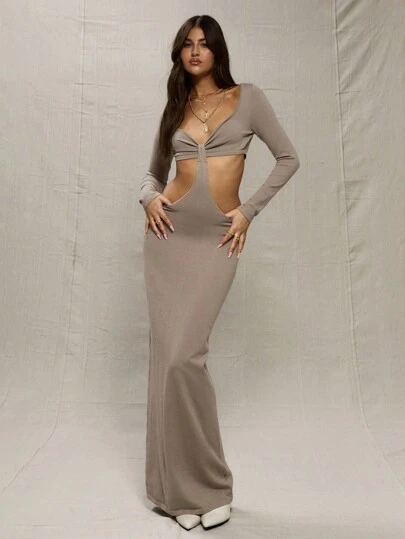 MUSERA 灰色针织镂空侧边长裙,春夏早午餐可爱装扮 - 灰色 - 查看 1