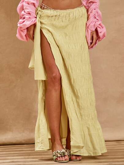 MUSERA 褶皱亚麻质感垂坠侧开衩长裙,夏日度假波西米亚风伊比沙岛优雅海滩俱乐部卡鲁伊时尚假日 - 黃色 - 查看 1