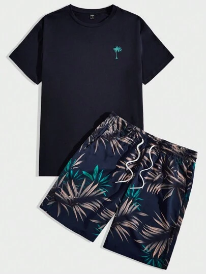 Manfinity BRENVOR 针织休闲椰子树印花T恤短裤套装,度假 - 藏蓝色 - 查看 1