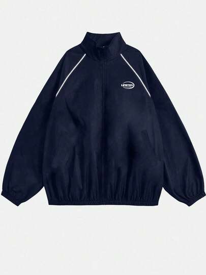 Manfinity Dauomo 男士休闲字母印花反光撞色条纹长袖夹克 - 藏蓝色 - 查看 1