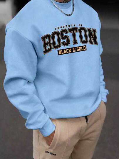 Manfinity Dauomo 男士圆领长袖字母图案休闲套头衫,秋季 - 藍色 - 查看 1