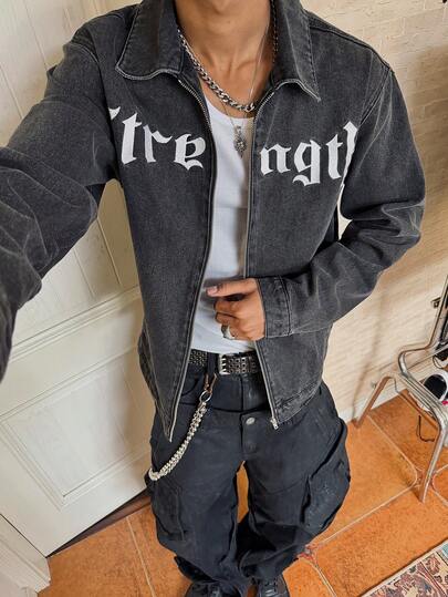 Manfinity EMRG 休闲街头风水洗黑色修身牛仔夹克,饰有哥特式文字刺绣,秋冬款 - 黑色 - 查看 1