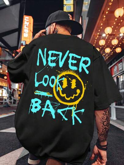 Manfinity RebelGame 男裝T卹,鬆身版型,圓領下垂肩短袖圖形T卹,微笑臉搞笑街頭風格,夏季聚酯纖維面料 - 黑色 - 查看 1