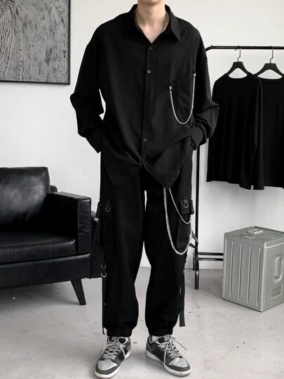 Manfinity EMRG 男士鬆身鏈子細節下肩襯衫和褲子 - 黑色 - 查看 1