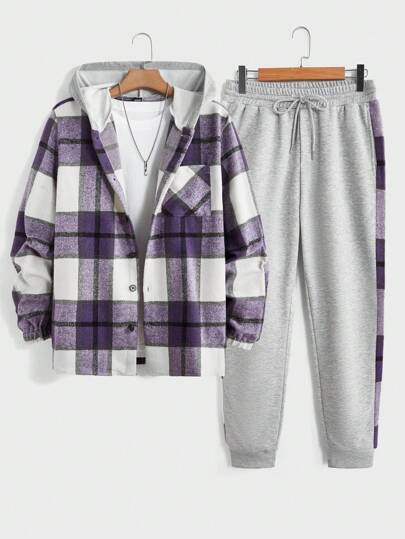 Manfinity RebelGame 男士格紋拼接帽裝襯衫配跑步褲,休閒兩件套裝 - 紫色 - 查看 1