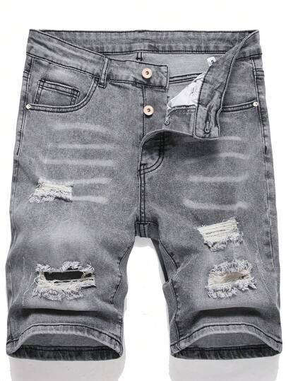 Manfinity EMRG 男士灰色破洞牛仔短褲,淺色素面假日復古款 - 灰色 - 查看 1