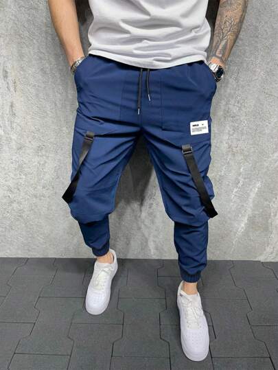 Manfinity EMRG 男士字母拼接束口腰長褲 - 藏蓝色 - 查看 1