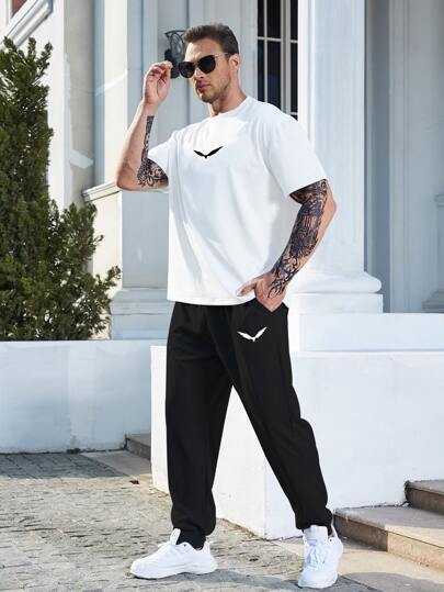 Manfinity Homme 男士鳥印花T恤和腰部抽繩衛褲 - 黑與白 - 查看 1