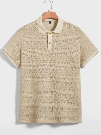 GENTILAND 男士中空設計純色卡其色休閒假期鈕扣短袖Polo衫 - 杏色 - 查看 1
