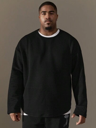 SHEIN Manfinity Homme 男士加大號寬鬆鵝卵石格紋圖案長袖t恤 - 黑色 - 查看 1