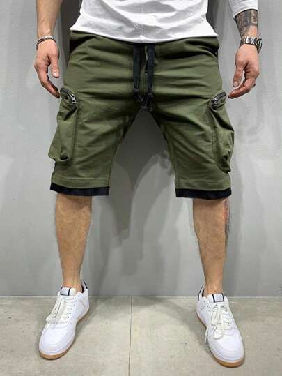 Manfinity Homme 男士拉鍊口袋拼接邊腰部抽繩短褲 - 軍綠色 - 查看 1