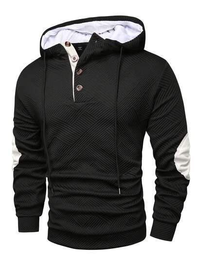 Manfinity Homme 男士纽扣半开襟长袖抽绳休闲连帽衫 - 黑色 - 查看 1
