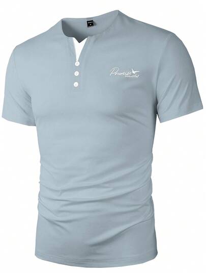 Manfinity Homme 男士字母印花纽扣设计短袖休闲T恤 - 淺灰色 - 查看 1