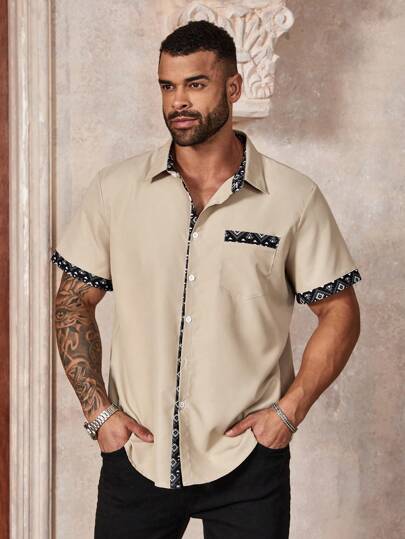 Manfinity Homme 加大尺寸男士寬鬆短袖衫,帶幾何印花和貼袋 - 卡其色 - 查看 1