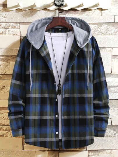 Manfinity Hypemode 男士格紋印花前排扣抽繩連帽不帶T恤襯衫 - 彩色 - 查看 1