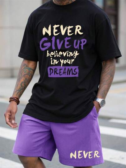 Manfinity LEGND 男士休闲标语印花T恤短裤套装,夏季 - 彩色 - 查看 1