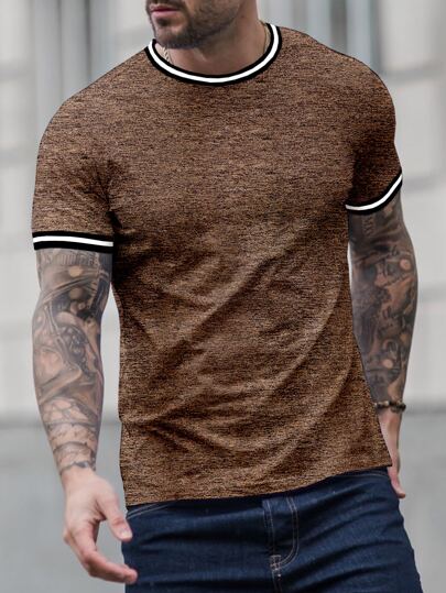 Manfinity Homme 男士條紋拼接邊T恤 - 棕色 - 查看 1