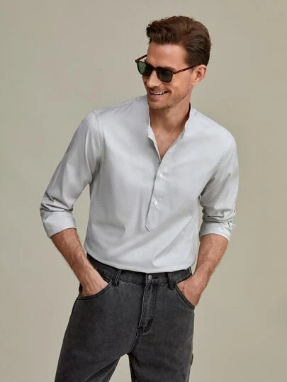 GENTILAND 男士素色半排扣襯衫 - 淺灰色 - 查看 1