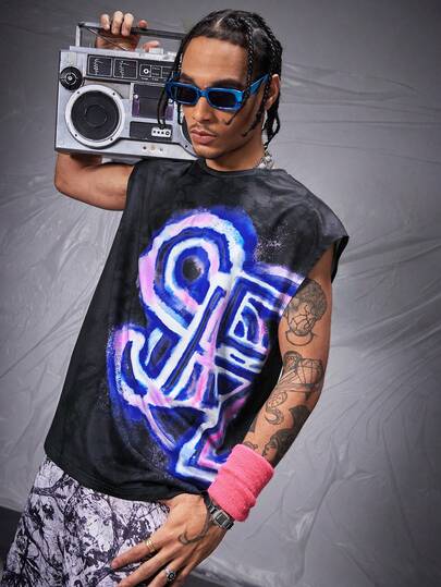 Manfinity VCAY 男式宽松数据印花针织无袖圆领背心 - 黑色 - 查看 1