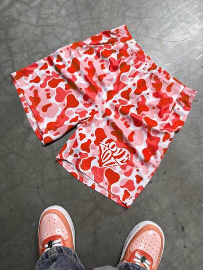 PAVTROS 男士字母迷彩印花松紧腰休闲短裤红色迷彩短裤粉色迷彩短裤心形短裤运动短裤 - 紅色 - 查看 1