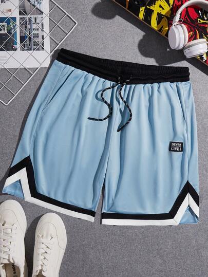 Manfinity VCAY 男士字母補丁細節拼接邊腰部抽繩短褲 - 淺藍色 - 查看 1