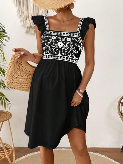 SHEIN 孕妇植物印花方领盖袖度假连衣裙 - 黑色 - 查看 1