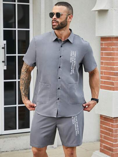 Manfinity Homme 男士大尺碼標語印花襯衫和短褲套裝 - 灰色 - 查看 1