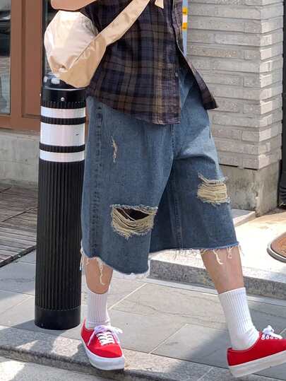 DAZY 男士破洞牛仔短裤(夏季) - 藍色 - 查看 1