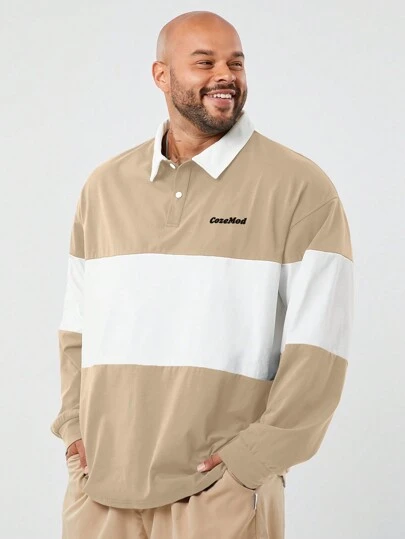 Manfinity VCAY 男式大码休闲针织拼接宽松落肩长袖 Polo 衫 - 棕色 - 查看 1