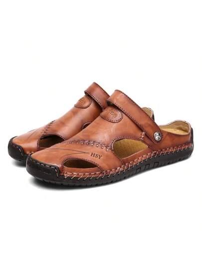 男士大碼PU皮革涼鞋和拖鞋手掌縫紉帶蠟線 - 棕色 - 查看 1