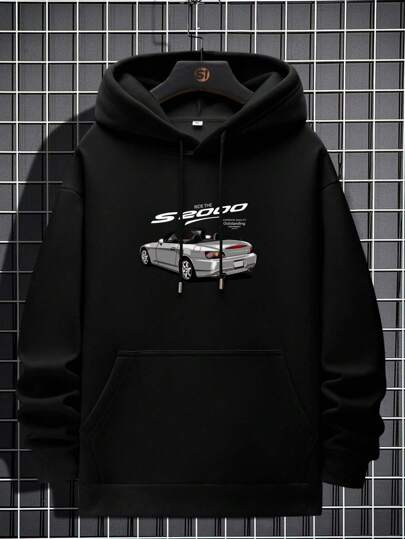 男士汽車和字母圖案袋鼠口袋抽繩連帽衫 - 黑色 - 查看 1