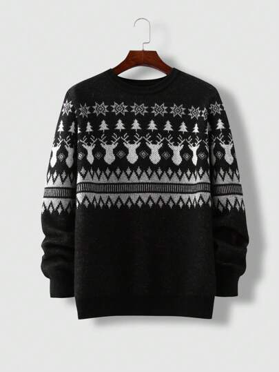 男士小鹿&幾何圖案套頭毛衣 - 黑色 - 查看 1