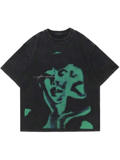 男士印花落肩T恤,透气 - 黑色 - 查看 1