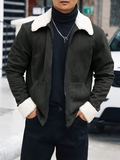 男士拼布泰迪絨拉鍊夾克 - 黑色 - 查看 1